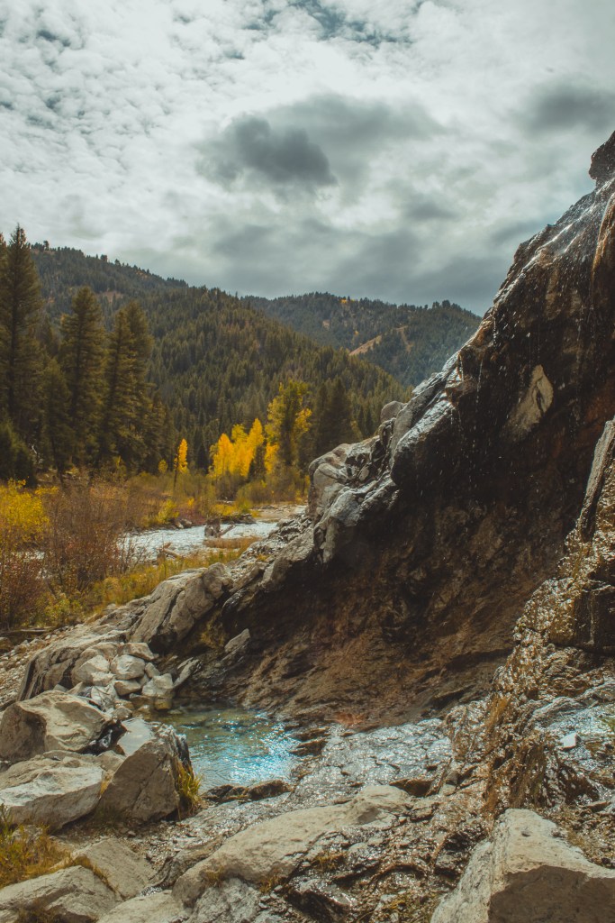 Skillern hot springs is not clearly visible right when you arrive at the boulder. Look for the hot water dripping down the rocks, colored in reds and oranges. These drips lead to pockets of water below the boulder, looking at the river!