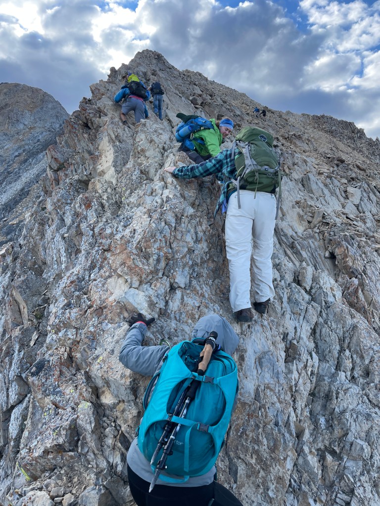 You’ll hike to Chicken out Ridge at about 11,200 feet (according to my watch which was logging our hike,) and takes you up to 11,700 feet. This means you’ll be climbing for about 500 feet. Ropes were not necessary for our group who all had experience climbing and hiking hard hikes, although would have been nice for that security net. There are multiple “no fall zones” where you really cannot fall. Thankfully it is very possible to keep 3 points of contact at all times, and me being only 5’2 and being able to reach all the necessary hand holds, it is not too technical of a climb. It is a very secure feeling scramble!