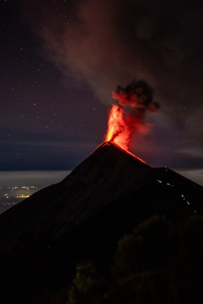 Acatenagno sits at 3,976 meters, and overlooks a super active volcano Fuego. Fuego spews smoke and lava every few minutes. We actually timed it and for an hour or so it never was dormant for more than 3 minutes. During the day it appears to be smoke and rock blowing out, but at night you will witness the red hot lava bursting into the night sky!